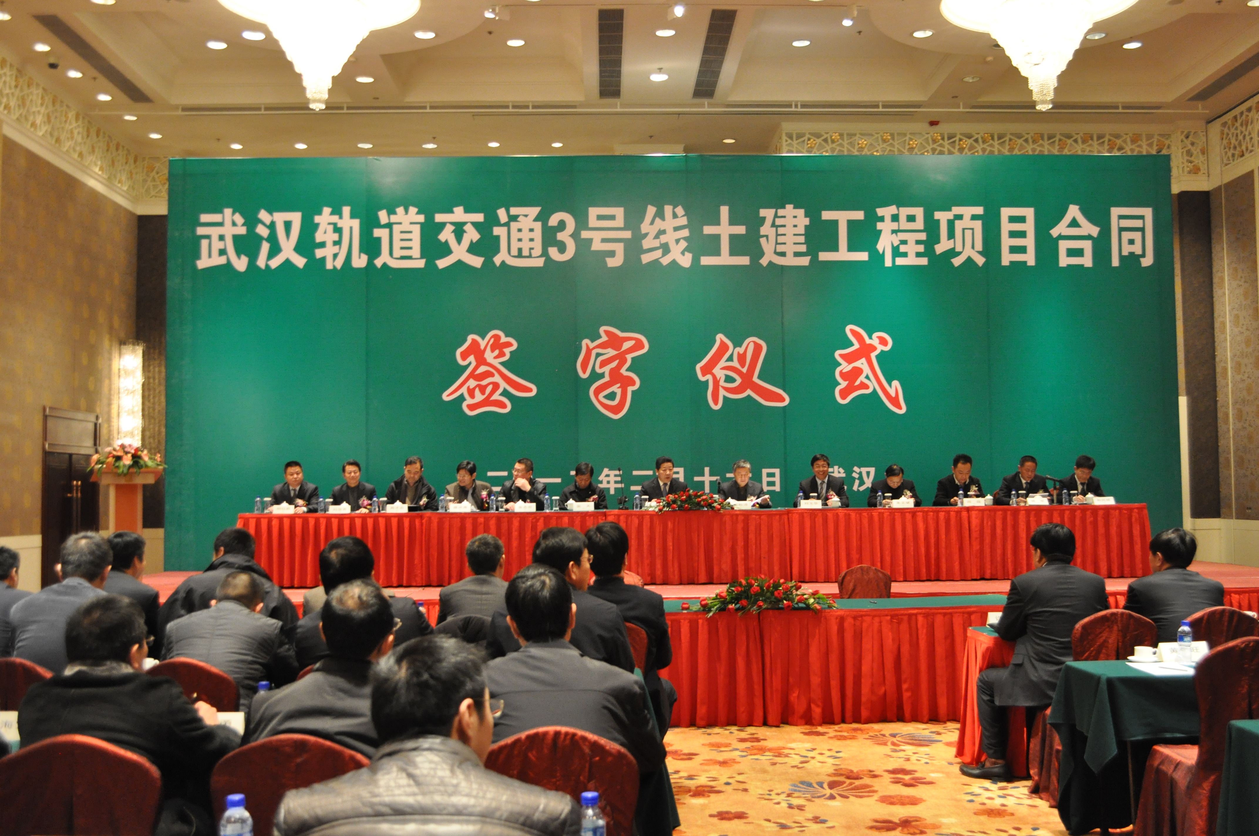 2012年2月16日下午,連通三金潭到沌陽大道的武漢軌道交通3號線一期土建工程項目合同簽字儀式在武漢香格里拉大酒店隆重舉行,標(biāo)志著武漢地鐵又一條線路進(jìn)入實質(zhì)性建設(shè)階段。武漢地鐵集團(tuán)總經(jīng)理劉玉華與14家中標(biāo)單位代表簽訂施工合同,武漢市發(fā)改委副主任熊貽沛、市相關(guān)部門領(lǐng)導(dǎo)、地鐵集團(tuán)董事長涂和平及其主要領(lǐng)導(dǎo)出席簽約儀式。