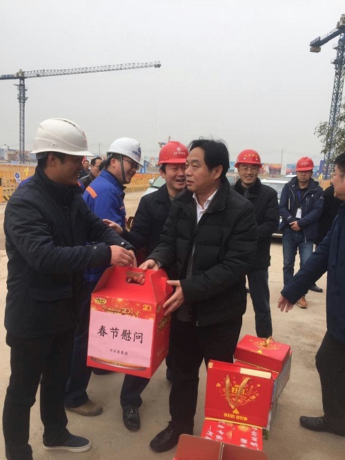 大年三十(1月27日),春節(jié)假期第一天,武漢城投集團公司董事長金國發(fā)、總經(jīng)理李兵,武漢水務集團王賢兵董事長一行輕車簡從,來到了由武漢水務集團負責代建的夾套河骨干箱涵工程項目建設現(xiàn)場,慰問了節(jié)日期間仍堅守崗位、奮戰(zhàn)一線工程現(xiàn)場抓緊施工的務工人員,并送上新春祝福和節(jié)日慰問。鐘鑫公司副總經(jīng)理尹艷軍、項目經(jīng)理付曉陽、彭軼作為工地代表領取了慰問品,也對城投集團領導一行對值守一線的職工進行春節(jié)慰問表示了衷心的謝意。