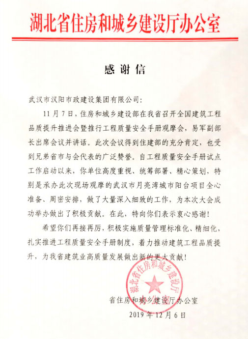 省住建廳在信中這樣說到“自工程質(zhì)量安全手冊(cè)試點(diǎn)工作啟動(dòng)以來,你單位高度重視、統(tǒng)籌部署、精心策劃,特別是承辦此次現(xiàn)場(chǎng)觀摩的武漢市月亮灣城市陽臺(tái)項(xiàng)目全心準(zhǔn)備、周密安排,做了大量深入細(xì)致的工作,為本次大會(huì)成功舉辦做出了積極貢獻(xiàn),在此特想你們表示衷心感謝?!?/span>