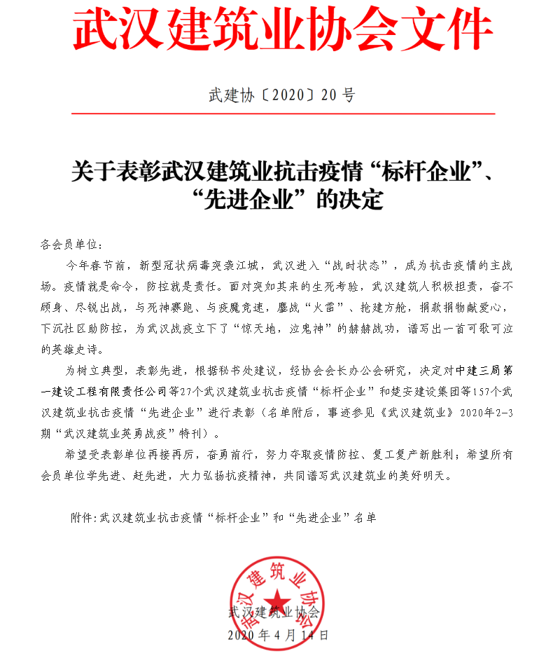 近日,武漢建筑業(yè)協(xié)會(huì)發(fā)布《武建協(xié)20號(hào)——關(guān)于表彰武漢建筑業(yè)抗擊疫情“標(biāo)桿企業(yè)”、“先進(jìn)企業(yè)”的決定》,對(duì)在抗疫“主戰(zhàn)場(chǎng)”積極擔(dān)責(zé),奮不顧身、精銳出戰(zhàn),與死神賽跑、與疫魔競(jìng)速的27家武漢建筑業(yè)“標(biāo)桿企業(yè)”、157家“先進(jìn)企業(yè)”進(jìn)行表彰。漢陽(yáng)市政鐘鑫市政公司在抗疫過(guò)程中主動(dòng)作為、勇于擔(dān)當(dāng),獲評(píng)“先進(jìn)企業(yè)”榮耀稱號(hào)。