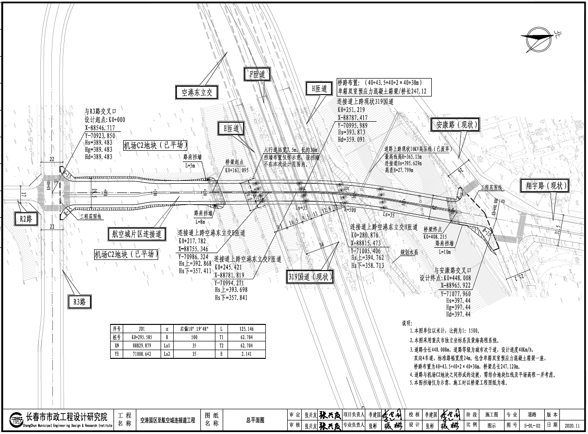 航空城片區(qū)連接道工程位于空港園區(qū)及航空城片區(qū),道路全長(zhǎng)448.008m,等級(jí)為城市次干路,設(shè)計(jì)速度40km/h,標(biāo)準(zhǔn)路幅寬24m,雙向4車(chē)道。該項(xiàng)目南端起于航空城已建R3路,向北經(jīng)過(guò)江北機(jī)場(chǎng)規(guī)劃?rùn)C(jī)務(wù)維修辦公區(qū)延伸上跨G319國(guó)道,終點(diǎn)止于空港園區(qū)安康路與翔宇路現(xiàn)狀交叉口。