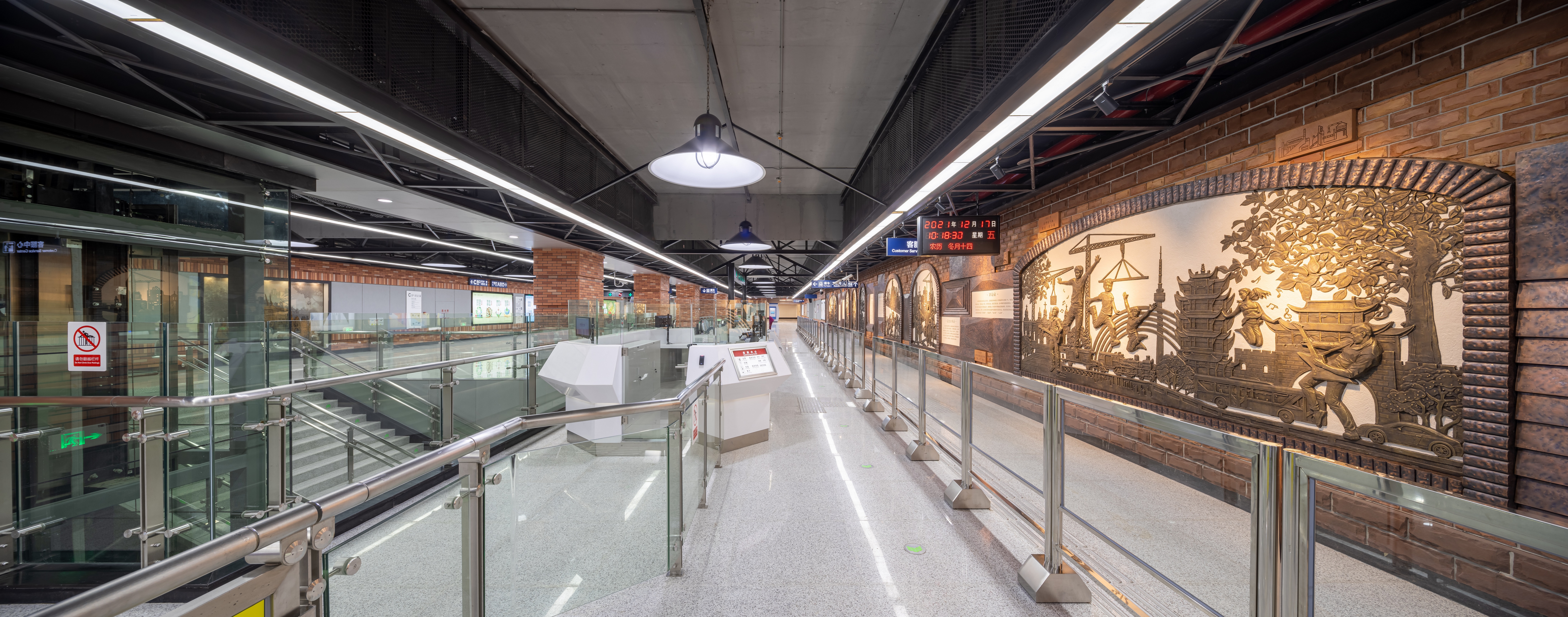 紅鋼城站以“紅城歲月”為主題,從紅鋼城的原始風(fēng)貌入手,車站立柱提取“紅房子”紅磚元素,采用仿紅磚質(zhì)感的高強(qiáng)纖維板進(jìn)行仿制,墻面還原老建筑形態(tài),上下采用紅色仿制磚,中間區(qū)域采用灰色的高強(qiáng)纖維水泥板,以打造懷舊的老武漢歲月感。車站照明燈具設(shè)計(jì)結(jié)合了極富工業(yè)元素的工礦燈,旨在將地鐵空間融入周邊環(huán)境,凸顯老武漢的街景特色。